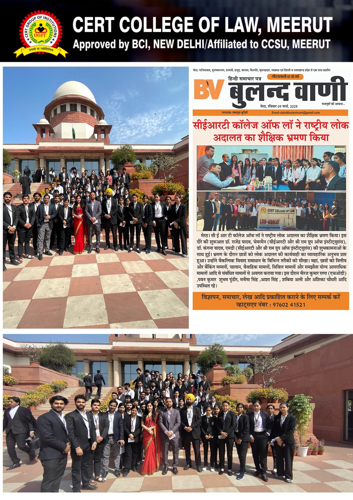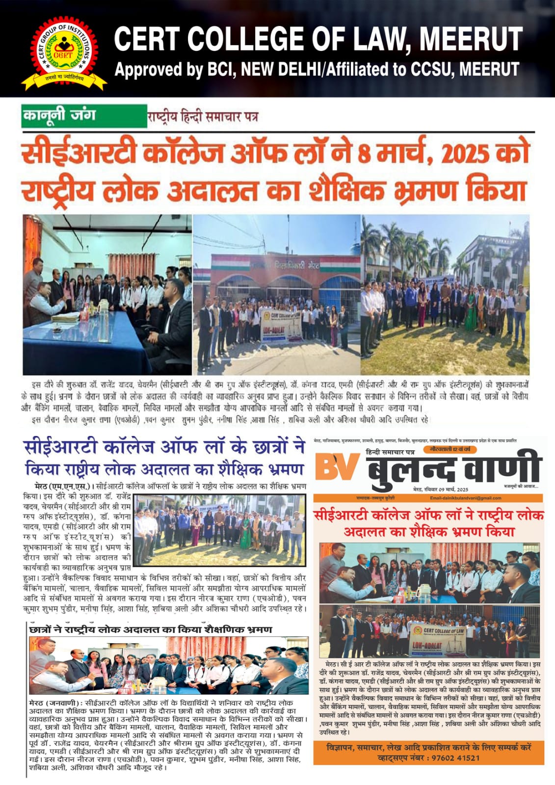 According to the Advocates Act of 1961, the Bar Council of India legally approved the college, and the most recent approval was issued via its letter number. 17.08.2022, BCI: D: 044/2022 (LE/App/Afflin) and also affiliated from the CCS University, Meerut letter no- 2235, dated- 27.09.2021
